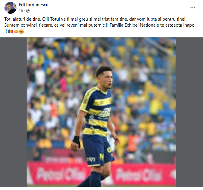 „Toți suntem alături de tine, Oli! Totul va fi mai greu și mai trist fără tine, dar vom lupta și pentru tine!! Suntem convinși, fiecare, că vei reveni mai puternic!! Familia Echipei Naționale te așteaptă înapoi!!”, a scris Edi Iordănescu, pe Facebook.