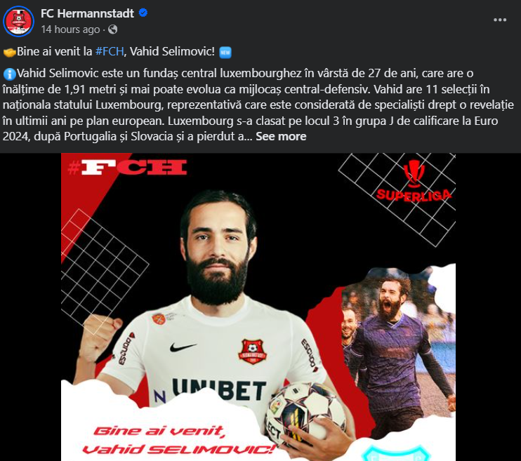 Clubul de fotbal Hermannstadt a anunțat recent transferul fundașului central luxemburghez Vahid Selimovic, în vârstă de 27 de ani. Jucătorul vine de la echipa bosniacă Zeljeznicar, care a încheiat sezonul pe locul 6 în prima ligă din Bosnia. În sezonul trecut, Selimovic a jucat 14 meciuri și a înscris un gol pentru echipa sa. Contractul dintre Hermannstadt și Selimovic este valabil pentru următoarele două sezoane.