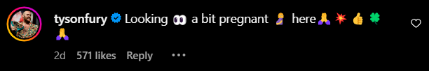 Chiar dacă Paris a născut acum 6 luni, luptătorul se pregătește să devină tată pentru a opta oară. Sportivul a dat de înțeles că soția sa ar fi din nou însărcinată. Paris a postat o fotografie pe social media. În descriere, vedeta a notat: „Be happy, be bright, be you” (Fii fericit, fii strălucitor, fii tu!). Tyson Fury nu s-a putut abține și a lăsat un comentariu: „Looking a bit pregnant here” (Pari puțin gravidă).