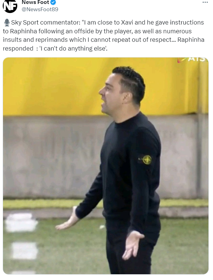 Printre indicațiile tactice oferite lui Raphinha, Xavi a „strecurat” o serie de insulte, pe motiv că a fost prins în offside de mai multe ori, irosind fazele de atac ale echipei. De șapte ori au fost surprinși catalanii în poziție afară din joc, majoritatea situațiilor avându-l drept protagonist pe brazilian.