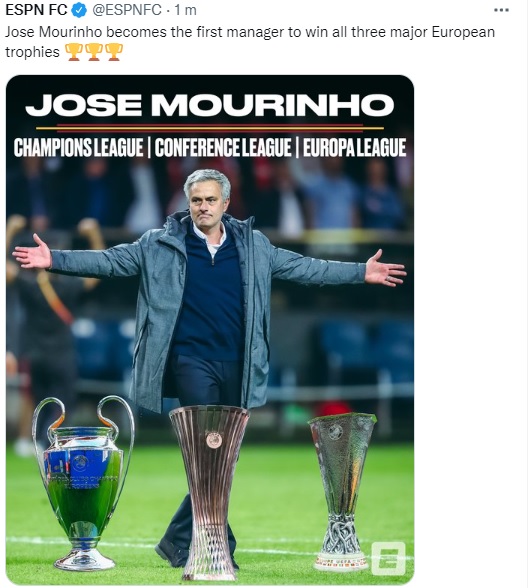 În cele din urmă, portughezul devine primul tehnician care s-a calificat într-o finală de cupă europeană cu 4 echipe diferite. FC Porto, Inter și Manchester United sunt celelalte 3 formații cu care a realizat o astfel de performanță.